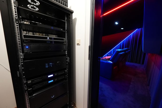 Bei der Bildwiedergabe sind es ebenfalls Detaillösungen, die ausschlagebend für einen großen Filmgenuss sind, denn nur durch die Kombination aus Sony VPL-VW870ES, einem Umlenkspiegelsystem sowie der frontseitig teilintegrierten iMasque³ reference, waren wir in der Lage, eine Cinemascope-Leinwand mit 340cm Bildbreite zu integrieren. Im Zusammenspiel mit Kaleidescape als Video-Server und der Control4 Steuerung erlebt der Kunde außerdem auch hohen Bedienkomfort, bis hin zu einer vollautomatischen Bildmaskierung.