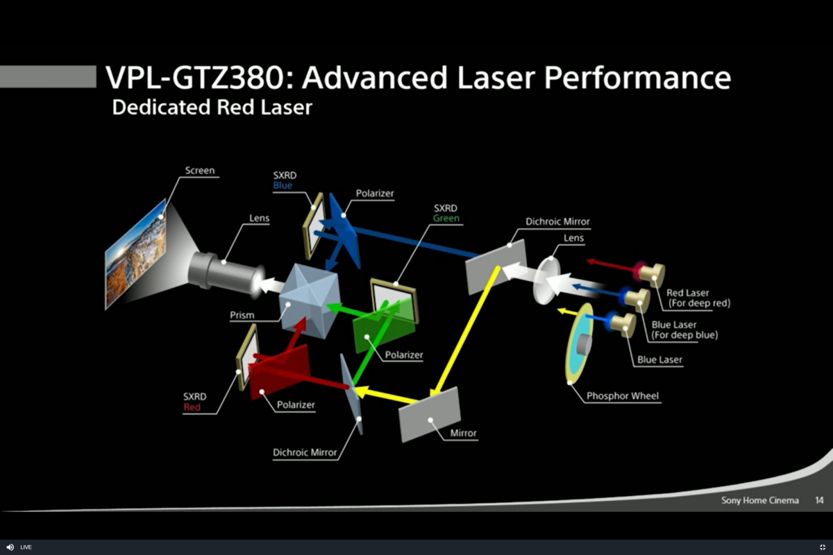 Das gesamte Grundprinzip des VPL-GTZ380 ist darauf ausgelegt, die Vorzüge intensiver Lichtleistung im Einklang mit hohem Kontrast und einer kompletten DCI-P3 Farbabdeckung zu nutzen. Im GTZ380 findet sich daher anstelle von Filtern im Lichtweg oder dem Objektiv, eine besonders aufwändige Laser-Lighte-Engine. Diese verfügt neben der "normalen" Hauptdiode, die über ein Phospor-Wheel arbeitet, noch jeweils eine Zusatzdiode für Erweiterung des Spektrums für Rot und Blau.